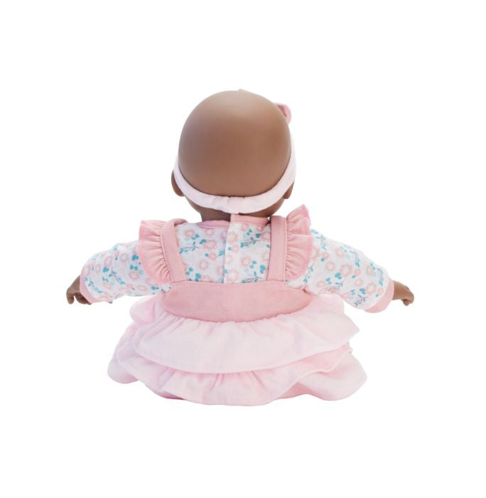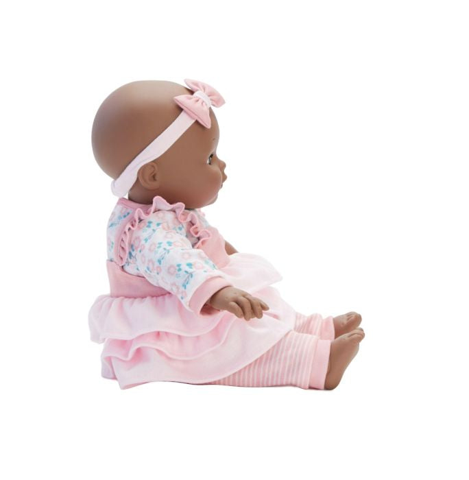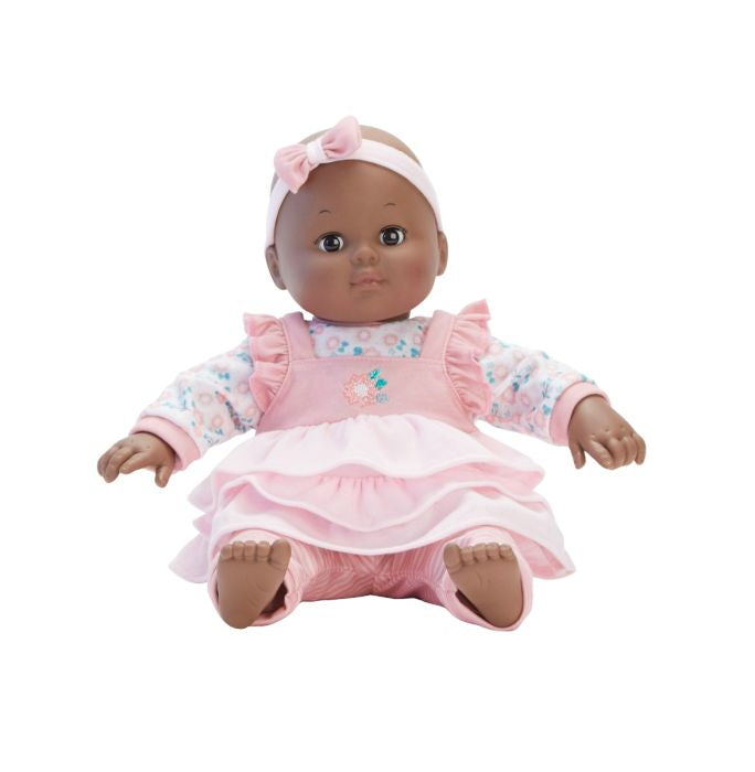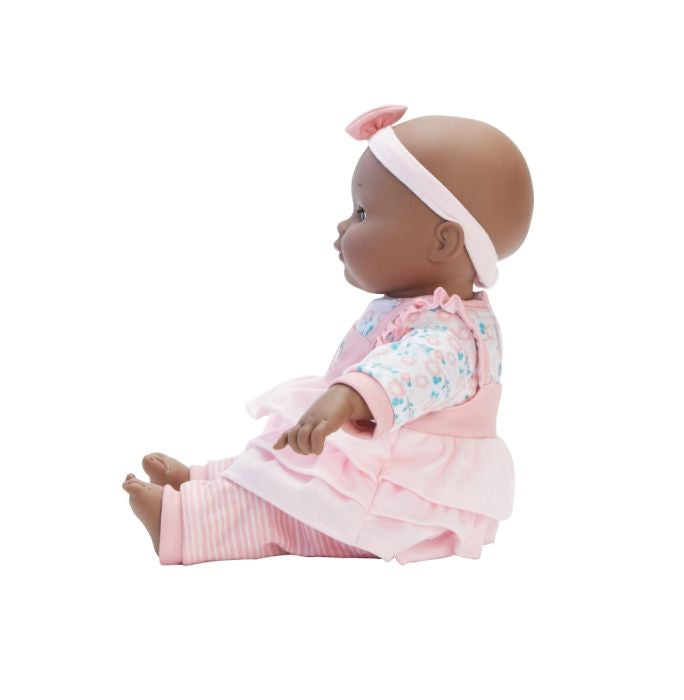 This 14" baby doll has a dark skin tone, brown eyes, and a soft-body with vinyl limbs. The doll wears a floral tee, a ruffled pinafore with floral embroidery, stripe leggings, and a headband with a bow. The baby comes with a bottle and is easy to clean with a damp cloth.