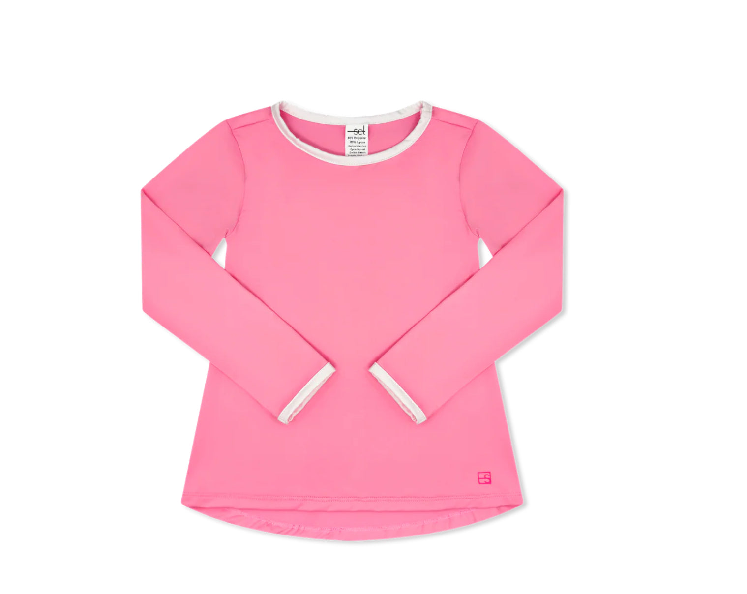 A sweet basic, perfect all year round! The Long Sleeve Bridget Basic Tee in Flamingo Pink with Pure Coconut welting athleisure is a must-have in all the prints and colorways! Did you know SET tops are designed to match and match with all our bottoms for a stylish look.
