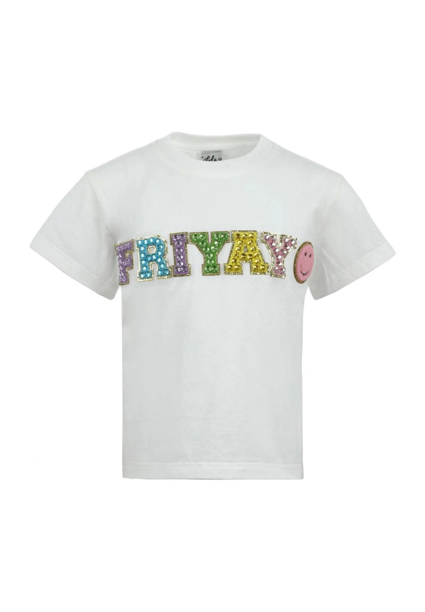 - Trendy white tee featuring a bold "FRIYAY" sequin design in rainbow hues.