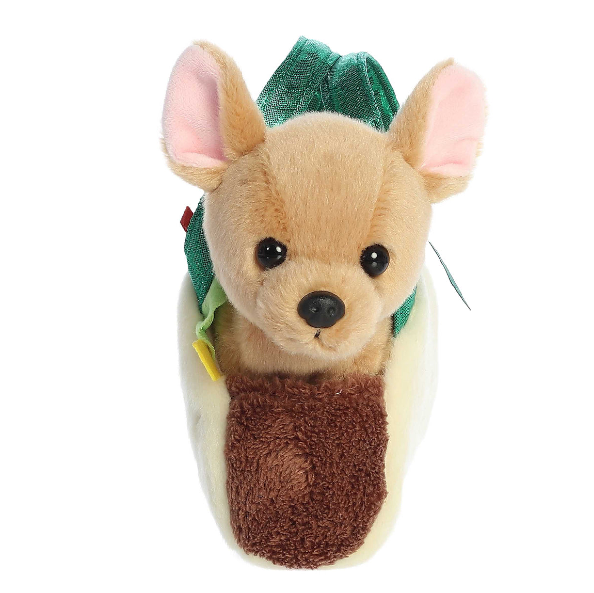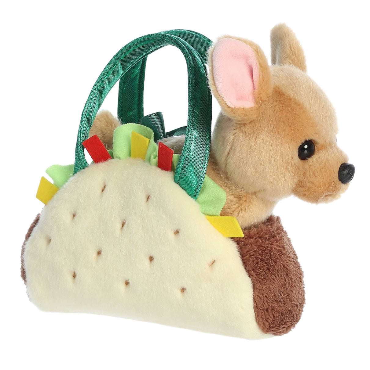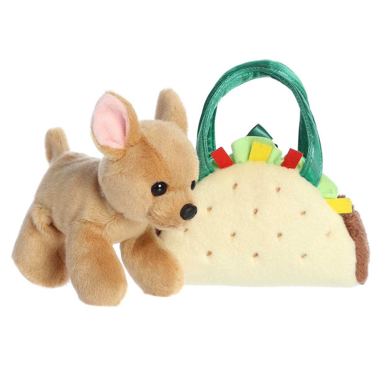 It's time to enjoy the Spicy Fun Taco Chihuahua Plush & Carrier Set, a zesty addition to the Fancy Pals collection that's sure to delight. This adorable set includes a soft, brown Chihuahua plush ready to snuggle or accompany your child on make-believe adventures. Tucked inside a plush taco carrier, complete with colorful toppings, this playful pup brings a dash of flavor to playtime.