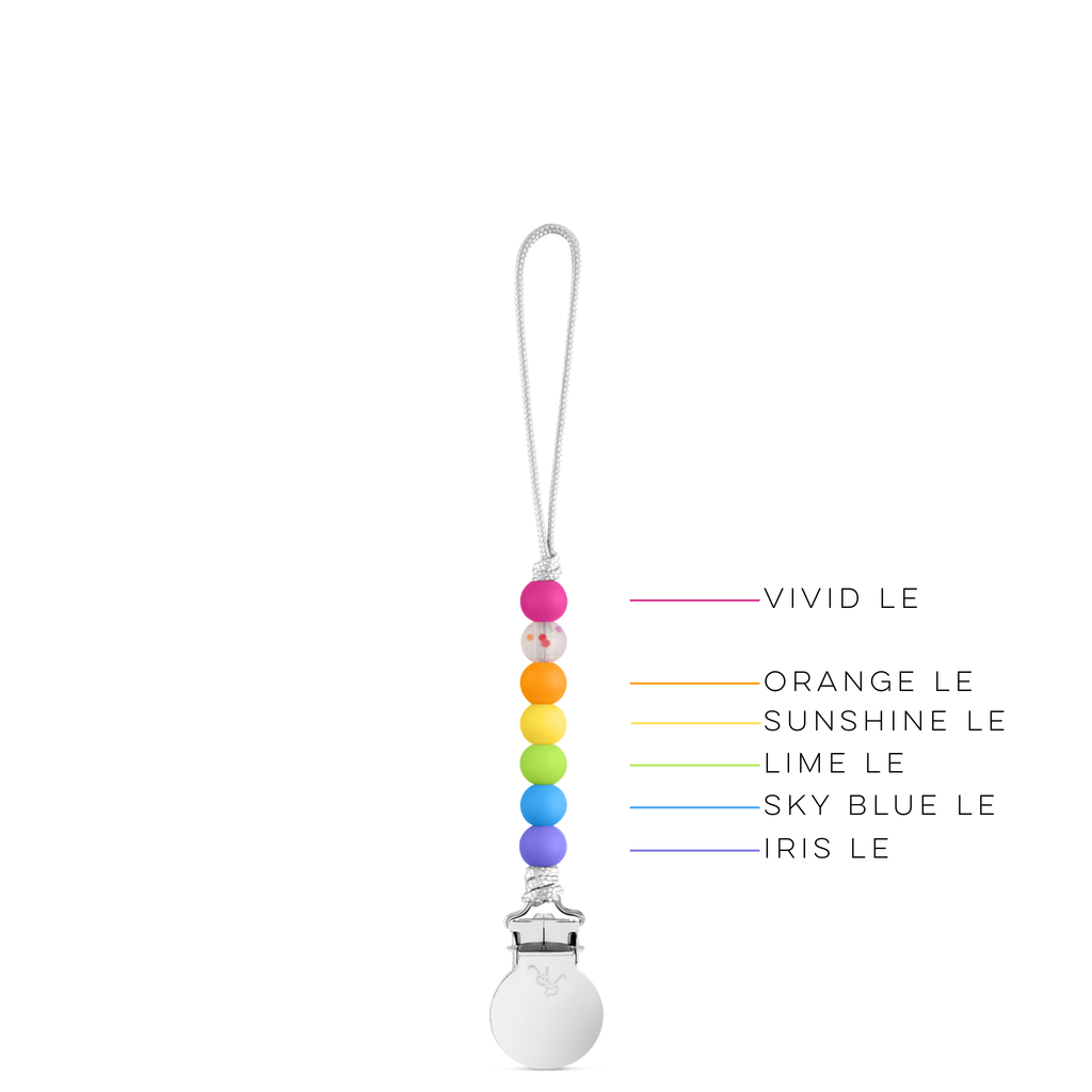 Nylon cord, five medium food grade silicone beads, and a lead free stainless steel Ryan & Rose clip.