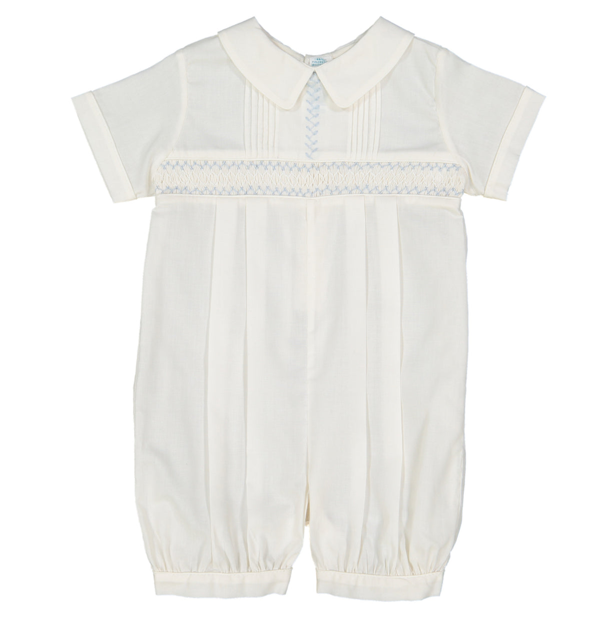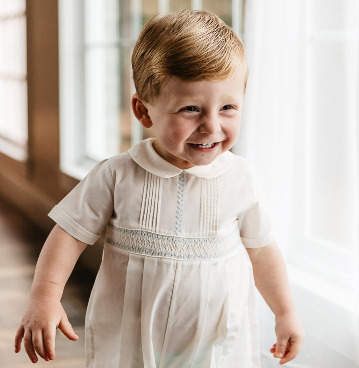 Moms have loved and trusted our unique vintage look for over 100 years. That's why our new Vintage Collection stays true to our timeless, heirloom style and quality. This beautiful smocked romper is made with intricate hand-made details: tiny hand-stitched pintucks, elegant hand embroidery, and fluted French lace trimming the collar. Grab this beautiful baby boy romper.