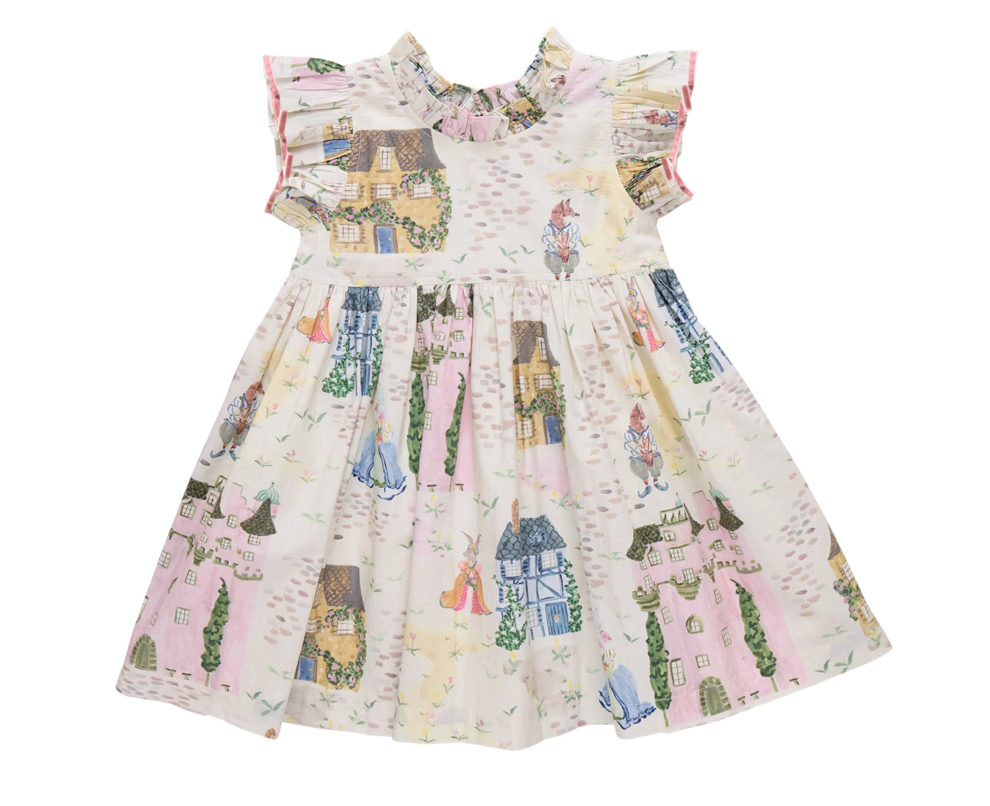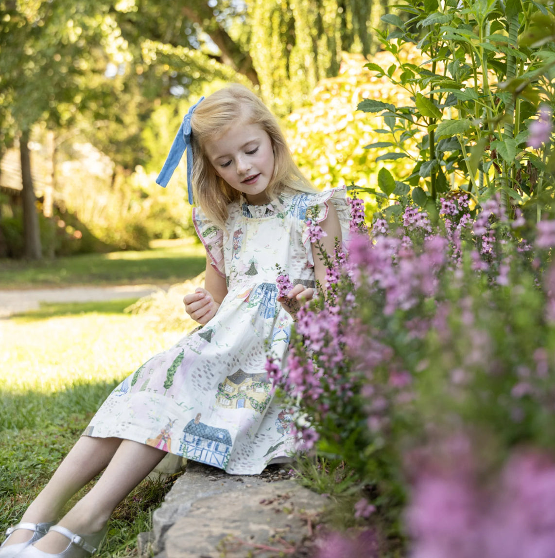 A storybook style brought to life through an exclusive artist collaboration with Tara Gill! This charming dress showcases illustrated castles and whimsical characters, finished with romantic ruffles and luxe pink velvet trim for a truly magical spring silhouette.