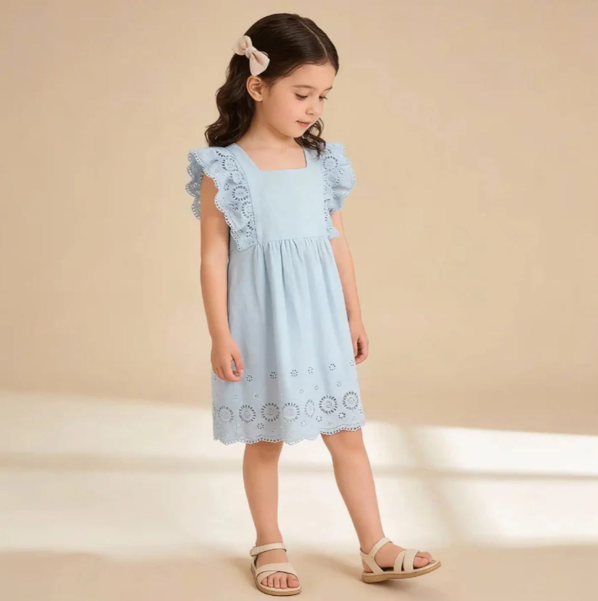 Welcome a touch of thoughtful style into her wardrobe with this Organic Eyelet Flutter Dress. Designed in a soft light blue hue with delicate eyelet detailing, it blends timeless charm with a fresh, airy feel.