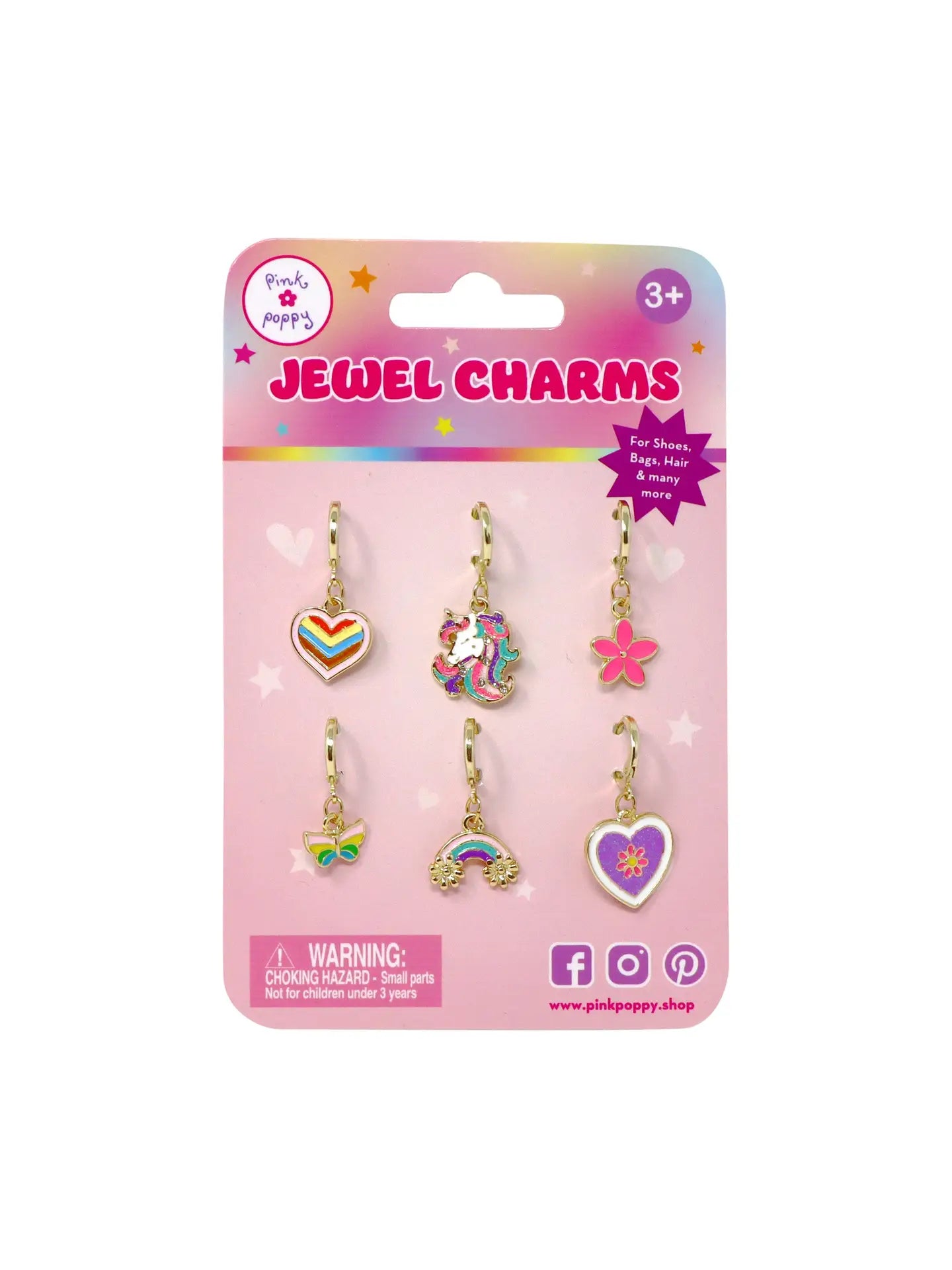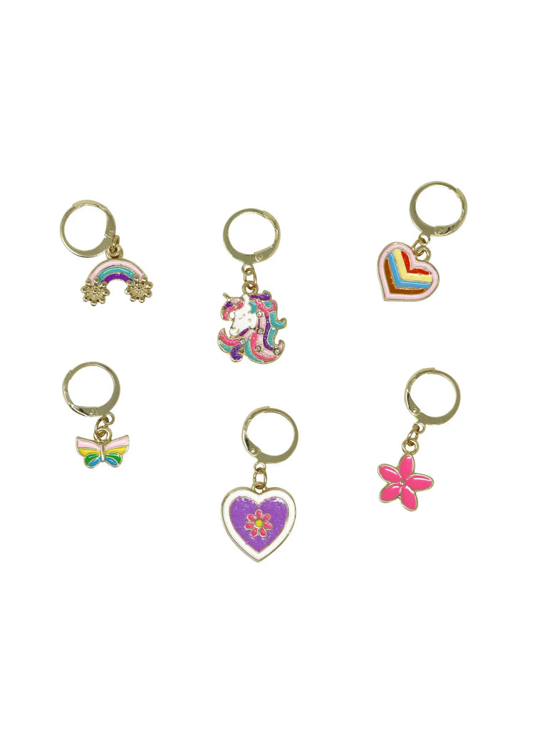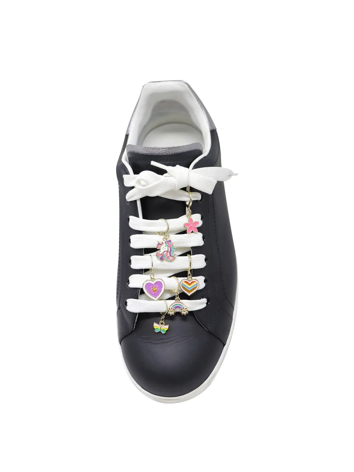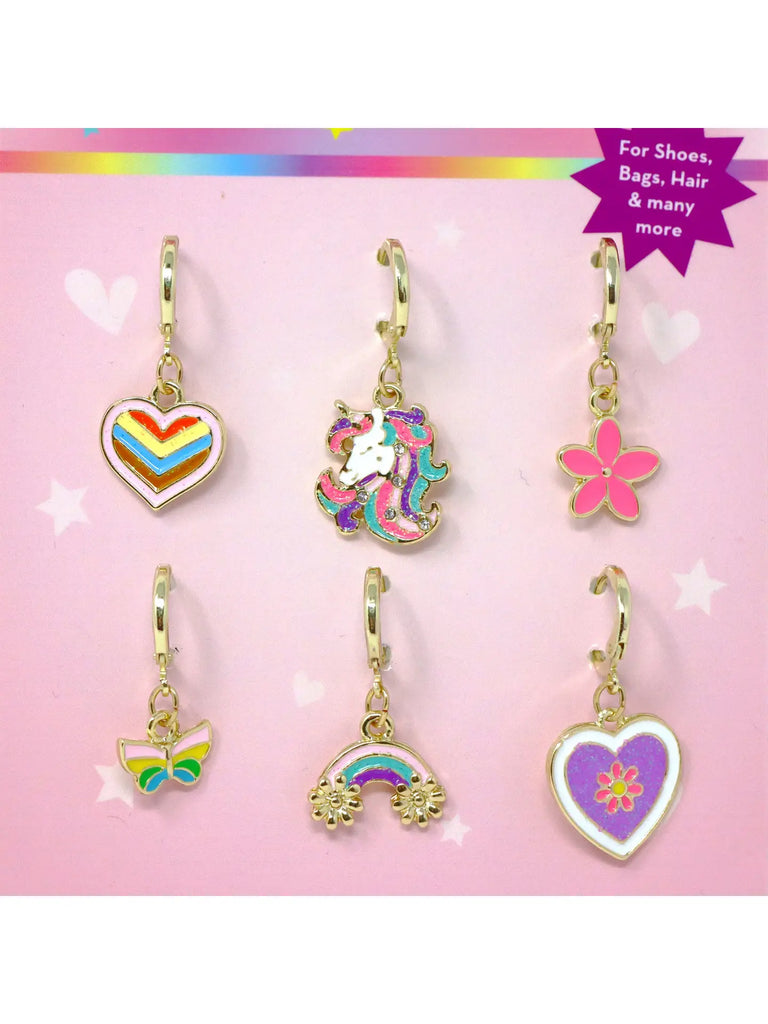 Rainbow Unicorn 6-pack Shoelace Charm Set features 6 beautifully crafted unique charms including a unicorn, rainbow, butterfly, flower, and 2 heart styles. Designed to easily attach to your shoelaces, you will be showcasing your individual style in seconds.