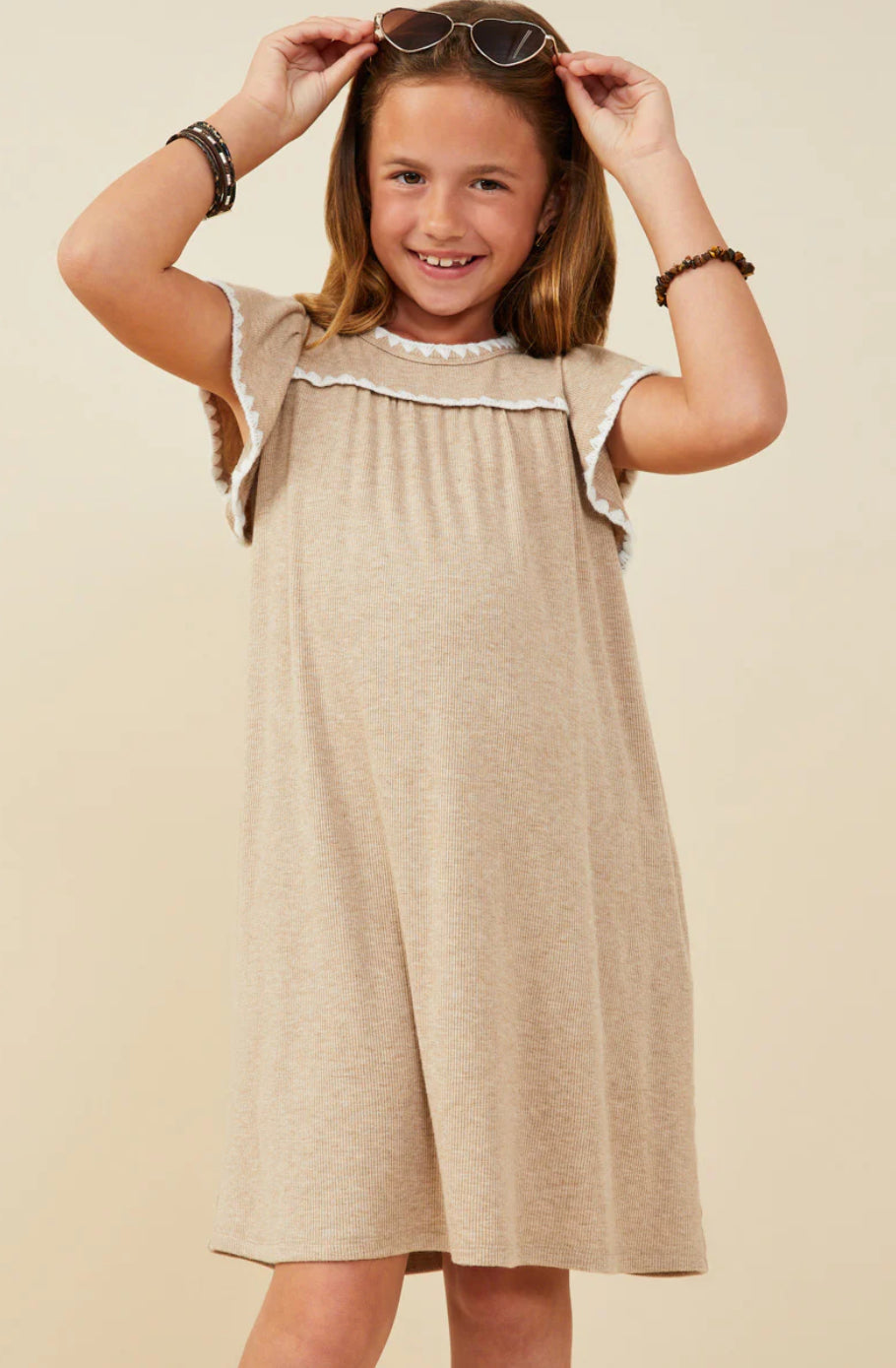 Ribbed Knit Dress | Taupe, Crochet Trim