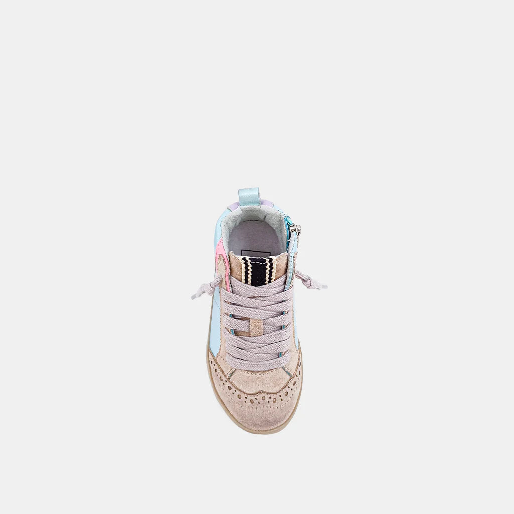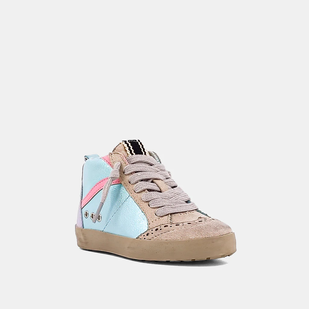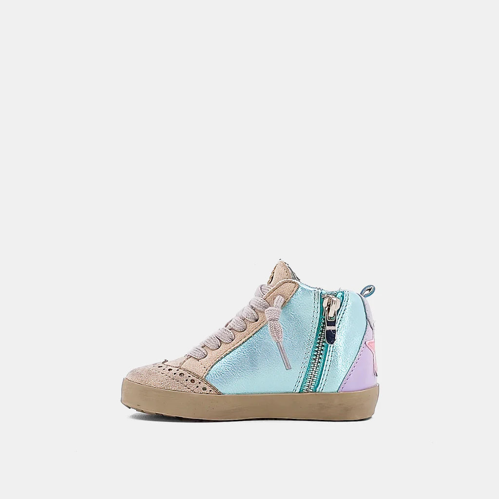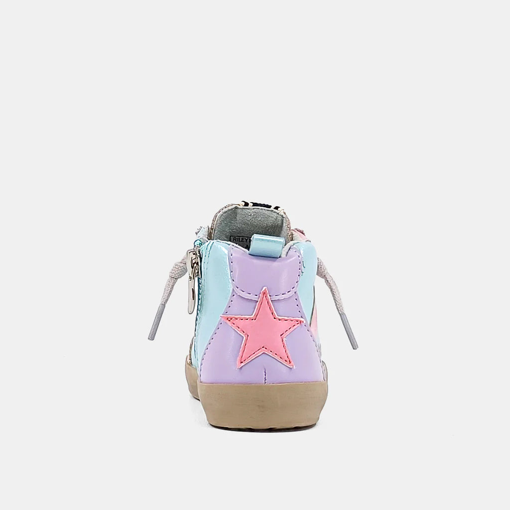 Introducing our Mommy and Me collection that includes mini versions of our products for your little one. Our Riley hi-top sneakers offer a contemporary take on traditional athletic shoes. They are available in updated colors and textures, featuring high-quality metallic faux leather and striking suede panels. Pairing them with your favorite denim will give you a comfortable and fashionable look.