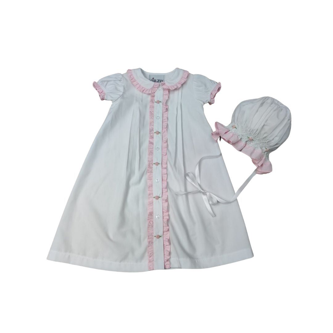 Ruffle Front Daygown & Bonnet Set | Pink Flowerettes - NB is backordered and will ship as soon as it is back in stock.