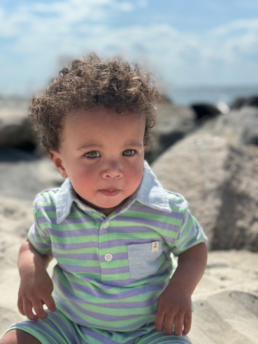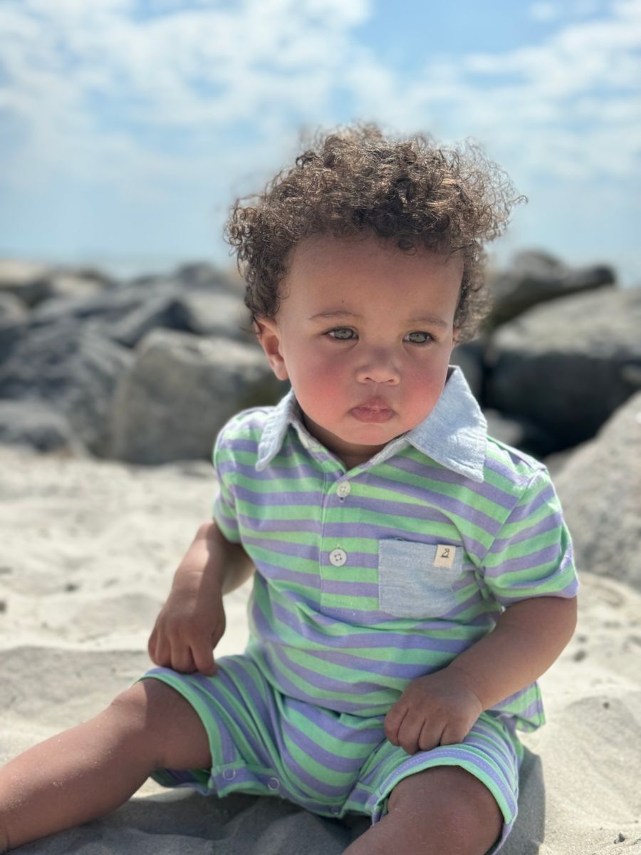 Saltash Polo Romper | Lilac & Green Striped - 0-3M is backordered and will ship as soon as it is back in stock.