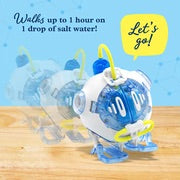 Discover how a metal-air electrochemical cell stores and discharges electrical energy using a simple saltwater solution. Explore the science of electricity, currents, and electric potential. An innovative pump mechanism provides a steady drip of salt water onto the magnesium plates and the robot walks for up to one hour on just one drop of salt water! The “fuel” bottle is easy to clean, refill, and reuse for hours of exploration.