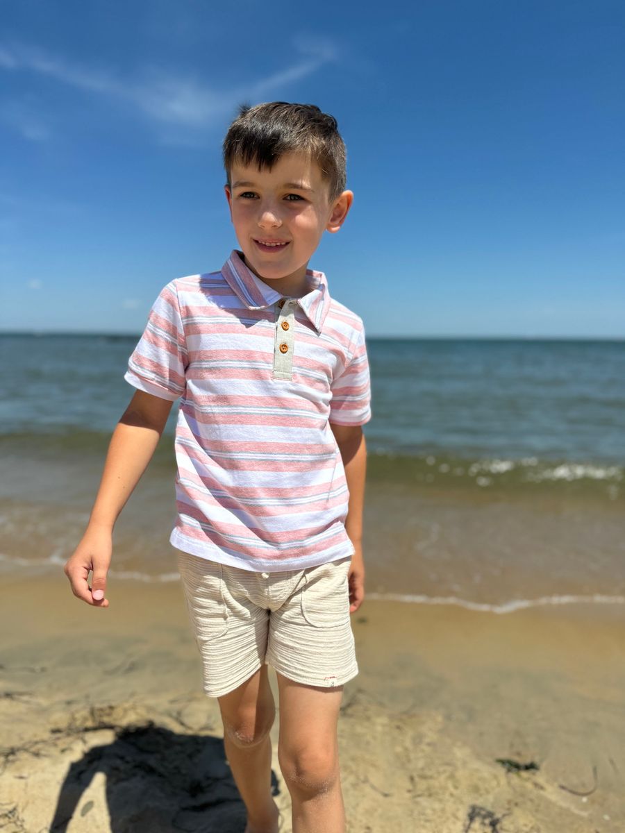 Shipping Polo | Pink & Grey Stripe - 3/4 is backordered and will ship as soon as it is back in stock.