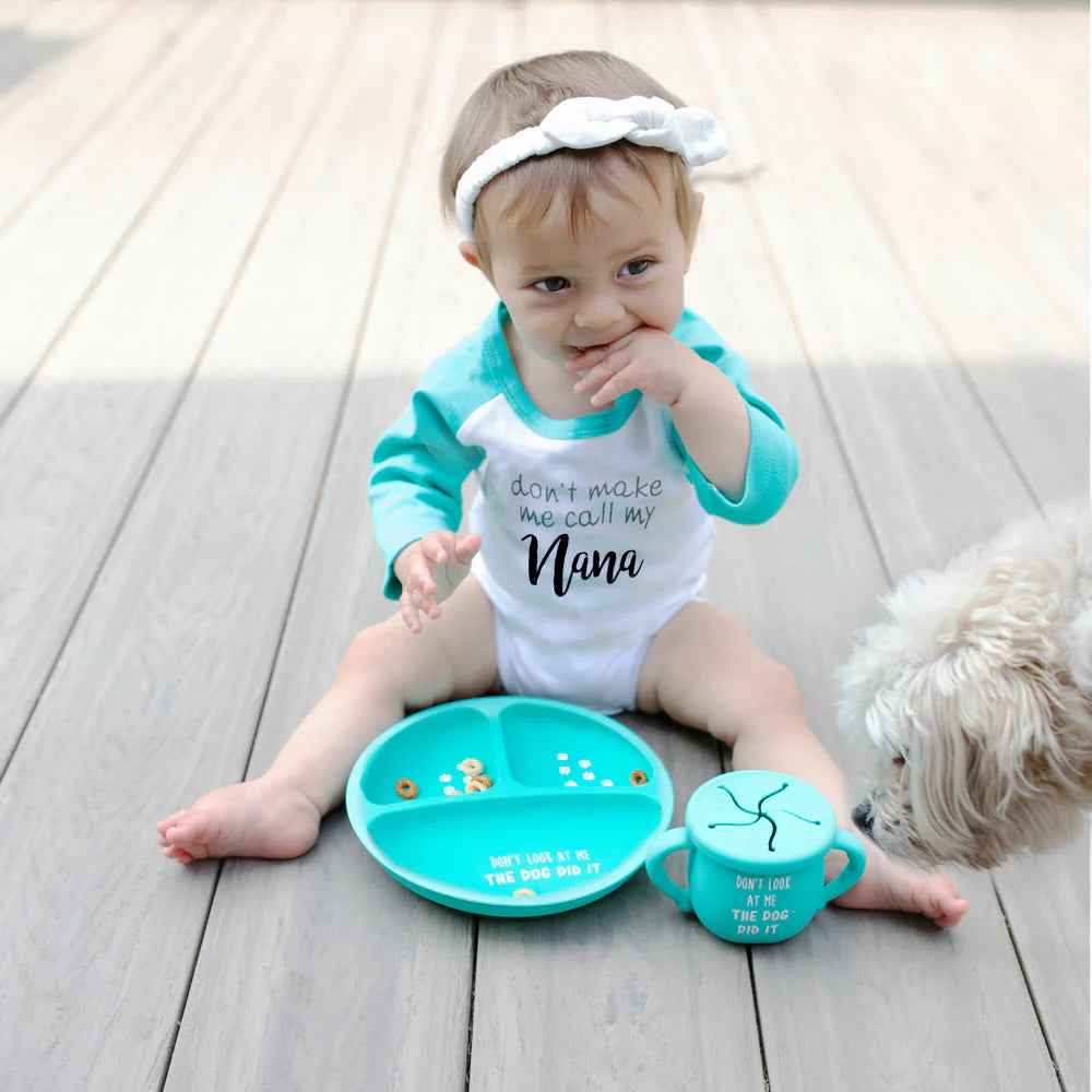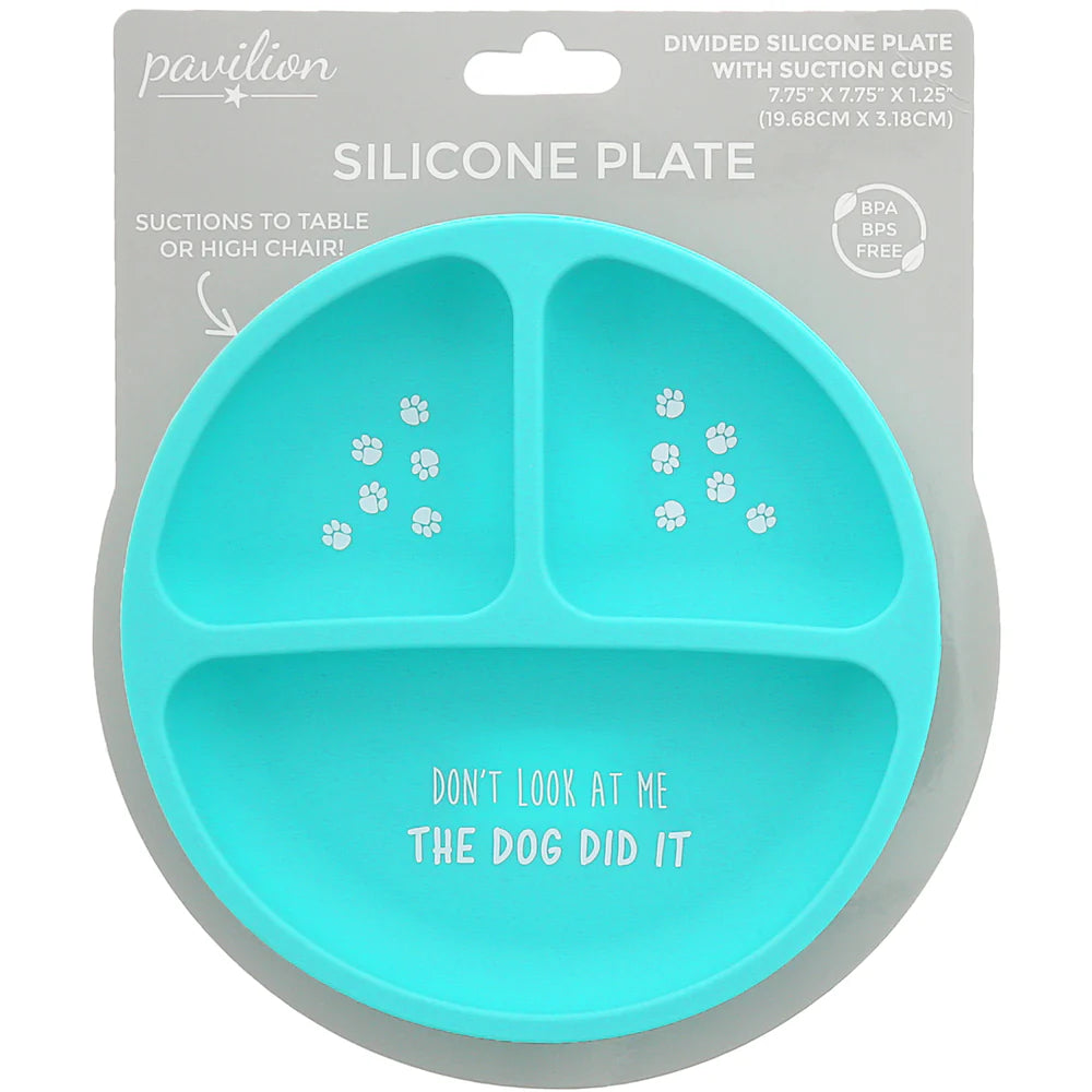 - IN-HOUSE DESIGN: The plate's body is teal. The "Don't Look At Me The Dog Did It" is in the biggest section. In comparison, the two smaller areas have a paw print pattern.