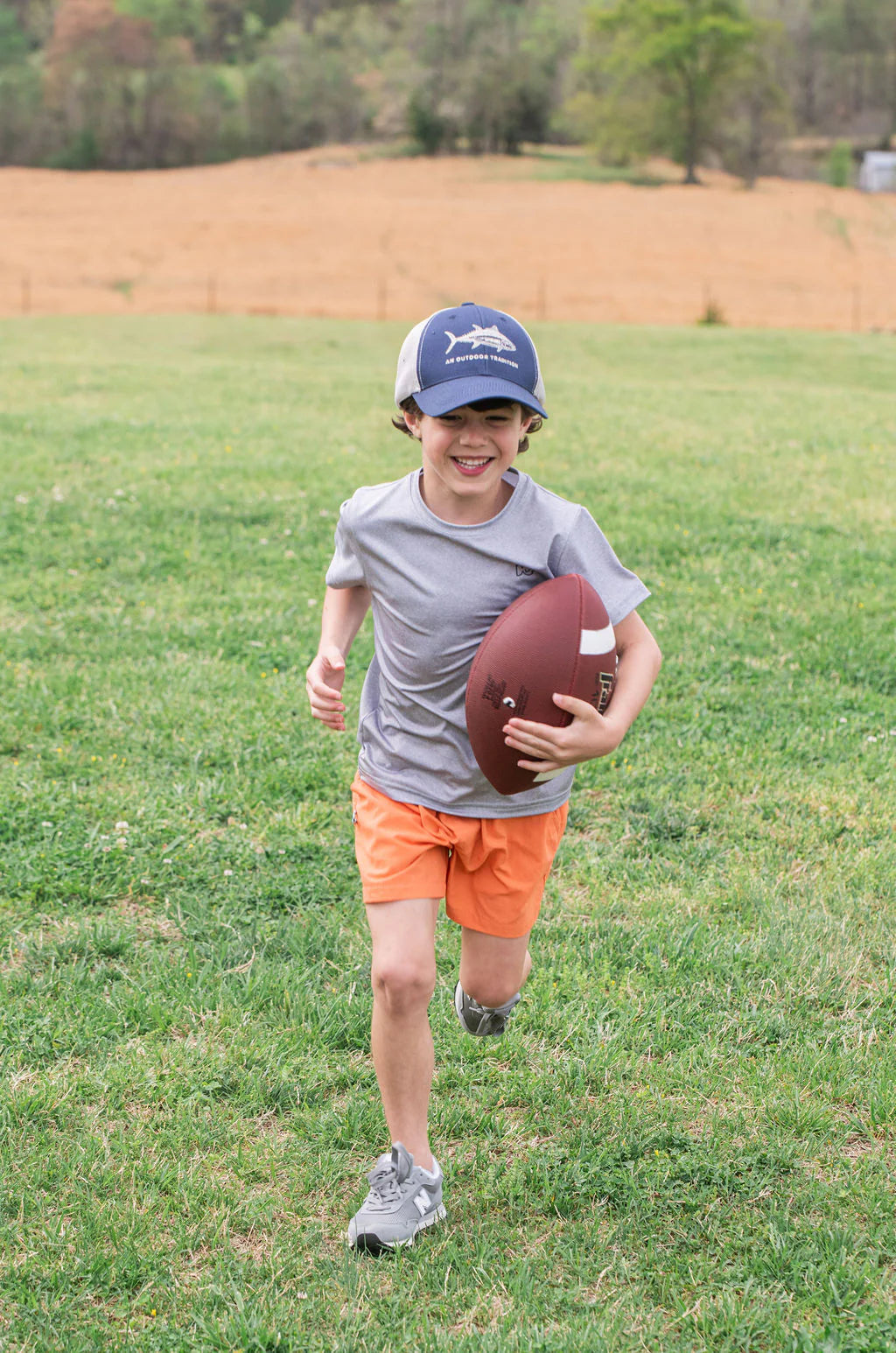 For little anglers and outdoor explorers, the Kids Outdoor Tradition Trucker Hat in Dark Denim Blue with Tuna Fish is the perfect finishing touch for sunny adventures. Featuring a bold embroidered tuna and breathable mesh back, this cap keeps kids cool, covered, and totally in style—whether they're casting lines or chasing crickets.