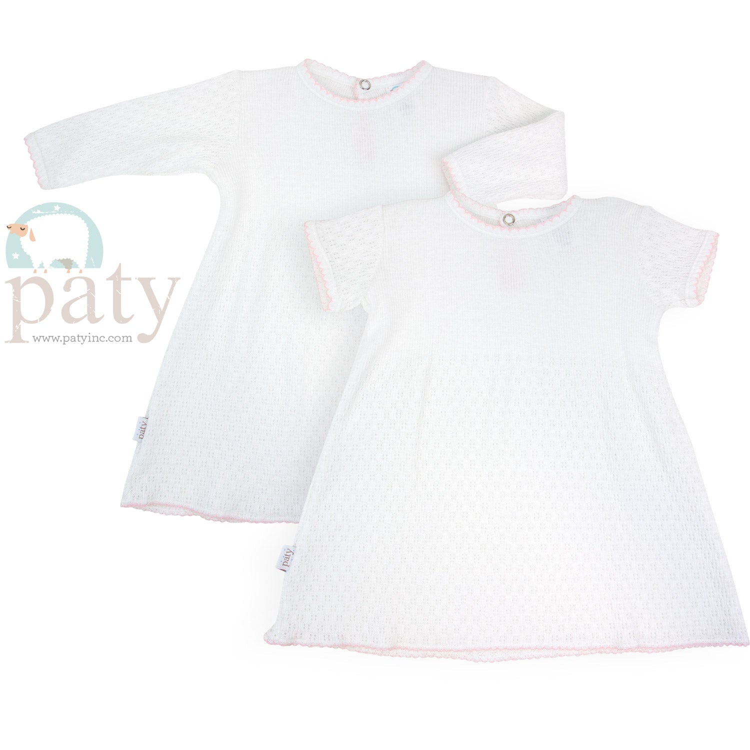 Solid white signature, 50/50 blend, Paty knit accented in colored picot trim.