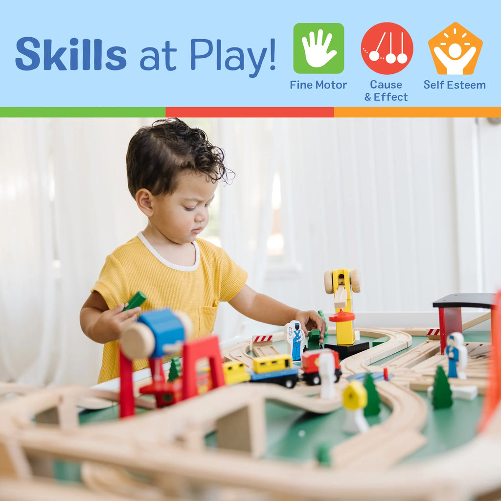 This amazing set includes everything needed for railway fun: a spacious roundhouse engine shed, dozens of track pieces in curves and straights, trees, workers and even traffic signs; multi-piece trains; magnetic-tipped cranes; switches and a T-junction for changing course; suspension bridge, trestle bridge and roundtable, too! A tremendous value! Mix and match it with other train sets--it's compatible with all popular wooden railway systems.